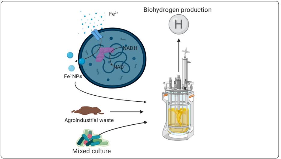Figure 5 Hydrogen production can be optimized by new technologies such as nanotechnology and synthetic biology acting directly on hydrogenases, such as Fe NPs, which can increase electron transfer from hydrogenases such as Clostridium acetobutylicum . This has been shown to work well in E. coli by implementing it in a synthetic route.