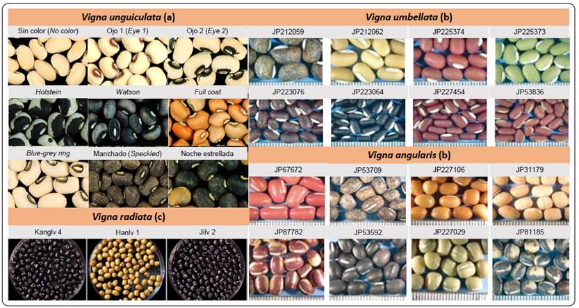 Figura 1 Variabilidad genética y fenotípica de las semillas de algunas especies del género Vigna cultivadas alrededor del mundo (Modificado y compilado de (a) Herniter et al. (2019), (b) Tomooka (2009) y (c) Wang et al. (2021)).