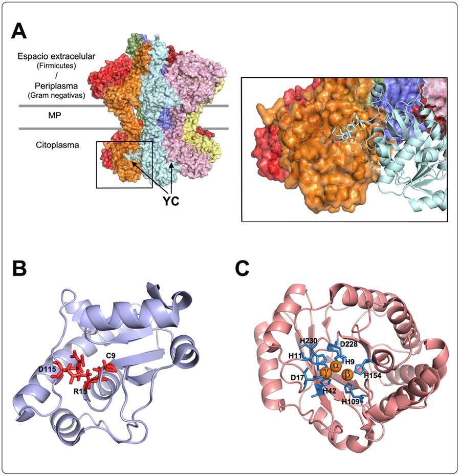 Figura 1 Enzimas bacterianas asociadas a fosforilación de tirosinas. (A) Octámero de BY-cinasa Wzc de E. coli (PDB: 7NHR), representación en superficie. Cada subunidad del oligómero se encuentra en diferente color. El YC de la región C-terminal de dos subunidades se indica por las flechas. Izquierda, amplificación del recuadro marcado, la superficie de la subunidad coloreada en cian se retiró para poder visualizar la incorporación de su YC en el sitio catalítico de la subunidad contigua (naranja). Las tirosinas (Y715, Y717 y Y718) de la subunidad en color cian se muestran como barras. (B) Representación en listones de la LMW-PTP Wzb de E. coli (PDB: 2FEK), los residuos catalíticos (C9, R15 y D115) se muestran en barras rojas. (C) Representación en listones de la PHP de Lactococcus lactis subsp. Lactis (PDB: 4GC3), los 3 cationes divalentes (α, β y γ) se muestran como esferas naranjas y los residuos de aspartato e histidina asociados a éstos se indican en barras azules (H9, H11, D17, H42, H109, H154, D228 y H230). La visualización de las estructuras y la preparación de las imágenes se realizaron con PyMol 2.0.