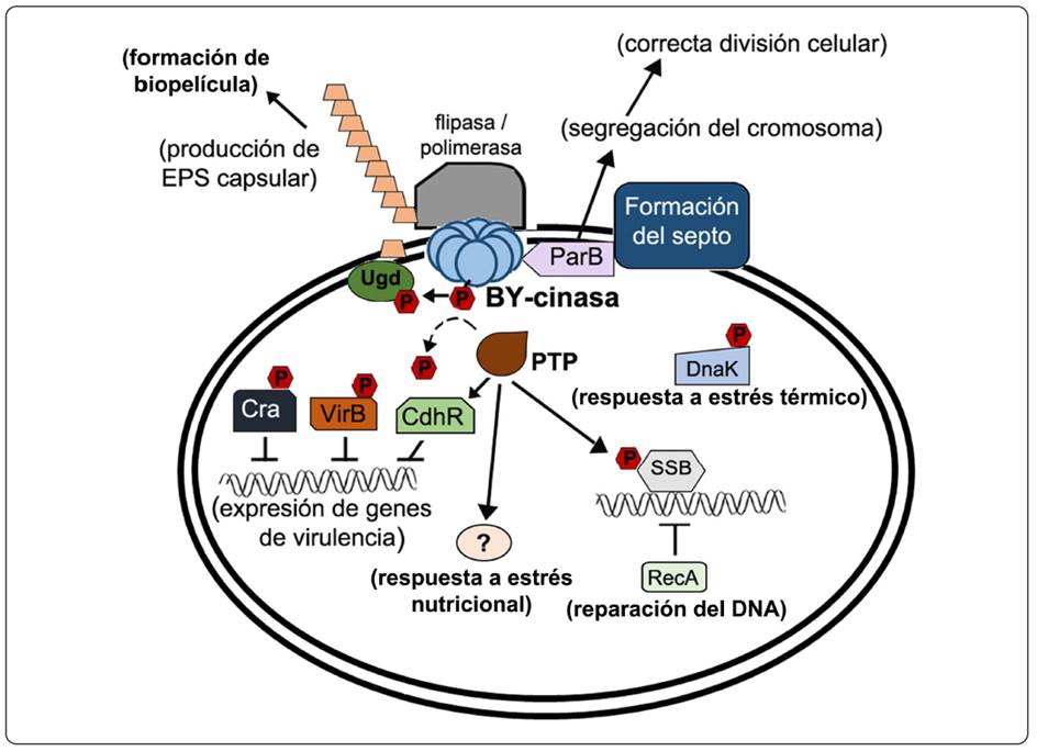 En particular, la fosforilación de las tirosinas en bacterias representa una de las MPT más recientemente descritas y por consiguiente se mantiene como un área poco entendida. Al respecto se han conseguido avances considerables en el ámbito estructural y catalítico de las principales enzimas asociadas con la fosforilación en tirosinas, las BY-cinasas. Diferentes evidencias indican que estas enzimas operan como oligómeros acoplando su ensamble/desensamble con su actividad de autocinasa en coordinación con la actividad de sus enzimas fosfatasas específicas. Principalmente estudiadas respecto al metabolismo de polisacáridos extracelulares. Se sugiere que el mecanismo de acción de las BY-cinasas se asemeja a una especie de cronómetro molecular el cual sincroniza la síntesis y exportación de los PC. La coordinación temporal de las BY-cinasas hacia eventos extra-citoplasmáticos es posible que también opere con respecto a los procesos intracelulares que regula la fosforilación en tirosinas, como son la división celular y la respuesta a diferentes condiciones de estrés. En este sentido, la distribución ubicua de las BY-cinasas y su significativa disimilitud respecto a las enzimas tirosina cinasas eucariontes, son aspectos que han incentivado la búsqueda de inhibidores específicos que se pudieran implementar en un contexto infeccioso para limitar la capacidad de proliferación y/o respuesta al estrés de las bacterias patógenas.