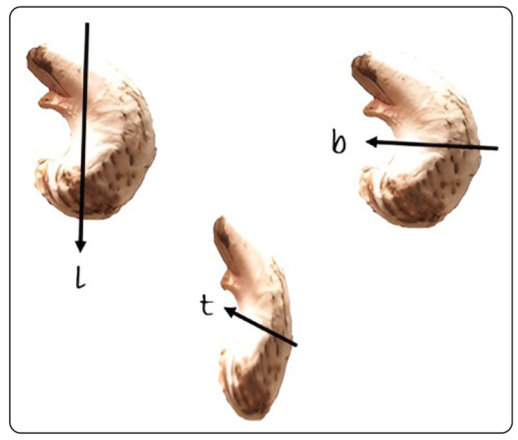 En la Tabla I se presentan las características físicas de las semillas de A. occidentale. Las dimensiones físicas (media aritmética) correspondieron a la masa (2.15 ± 0.410 g) de un rango de 0.8-3.2 g; incrementándose en un 40 a 45 % al ser hidratadas, la longitud (l), 2.559 ± 2.867 cm (rango 1.051-3.708 cm); el ancho (b), 1.224 ± 0.192 cm (rango 0.741-2.392 cm) y el grosor (t), 1.185 ± 0.182 cm (rango 0.713-1.981 cm). En la Figura 2 se presenta el comparativo de los valores de estas tres características.