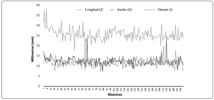 Figura 2 Gráfica con las dimensiones del total de muestras de semillas (nuez) seleccionadas (200 unidades) de A. occidentale.