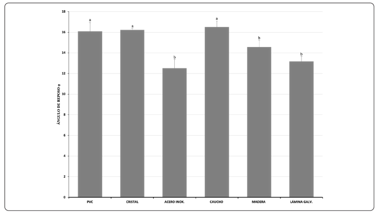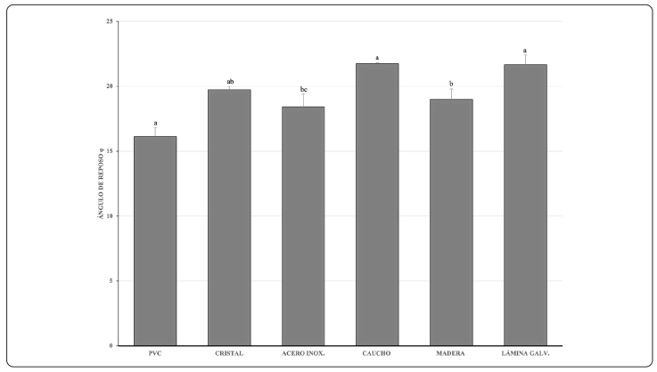 Para establecer el ángulo de reposo se utilizó un cilindro sin fondo de plástico de 10 cm de diámetro y 20 cm de altura, de manera manual el cilindro se llenó con una muestra de 200 g de semillas; colocándolo sobre distintas superficies planas, se levantó el tubo a una velocidad constante, de manera que el total de las semillas fluyeran formando un montículo; midiendo su altura y el diámetro del montículo, en las superficies (acero, plástico, caucho, lámina galvanizada, madera y cristal), que en general se utilizan como material de transporte en el proceso agroindustrial del producto.
