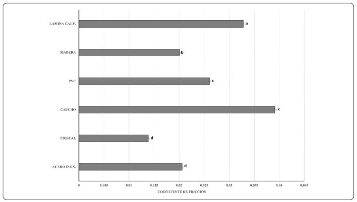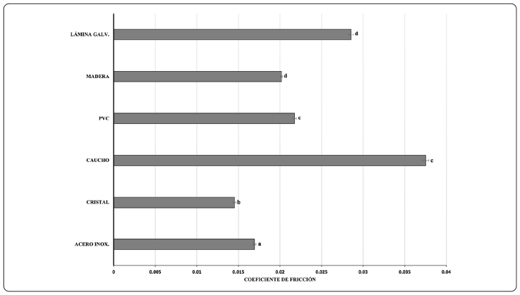 La determinación de esta propiedad se obtuvo al adaptar una sonda de fricción ASTM D 1894-90 en el equipo universal texturómetro (TA, XTPlus, Stable Micro System UK), y colocar una muestra determinada de semillas dentro de una caja de madera sin fondo, con dimensiones de 100 mm3 y levantándola 5 mm aproximadamente, de manera que solo las semillas tuvieran contacto con la superficie. Una vez instalado este sistema de montaje con la muestra, se ejerció una fuerza horizontal necesaria para desplazar la muestra sobre cada una de las 6 diferentes superficies a medir. La fuerza requerida para el desplazamiento fue registrada por el texturómetro y un total de 15 repeticiones por superficie. Una vez obtenidos los datos se calculó el coeficiente de fricción con la Ecuación 17 (Balasubramanian, 2001).