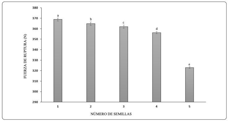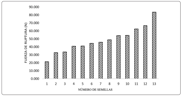 La fuerza de ruptura se determinó con las muestras en una superficie plana, se usó el texturómetro y un plato de compresión de 75 mm, al ejercer la fuerza se rompió la muestra, se realizaron 15 repeticiones con la semilla/nuez sin cáscara y 5 con la semilla con cáscara; los datos quedaron registrados en el equipo (Karaj & Müller, 2010).