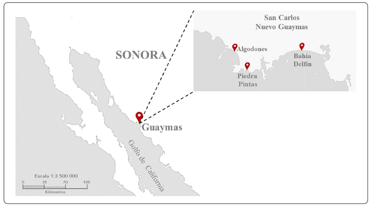 Las algas se colectaron durante el mes de junio de los años 2017 a 2019; además, en el año 2017, en los meses de marzo, mayo y junio, para observar la variación estacional del contenido proximal del sargazo. Los muestreos se realizaron en San Carlos Nuevo Guaymas (Figura 1) en las localidades de San Francisco, Bahía Delfín (27.9591° N, 110.9857° O), Algodones (27.9621° N, 111.0997° O) y Piedras Pintas (27.9389° N, 111.0871° W). En cada lugar se muestrearon de 20-25 kg de algas a la deriva, que fueron transportadas en bolsas de plástico al laboratorio de análisis; se eliminaron las epífitas y el material de interés se identificó con base en las claves taxonómicas de McCourt (1984) y Norris (2010). Las algas se lavaron tres veces con agua corriente sumergiéndolas en agua durante 10 min y se secaron a la sombra hasta alcanzar una humedad ≤ 4 %, determinada por el método 945.09 de la AOAC (2000). Enseguida se tamizaron para eliminar posible arena remanente, se molieron en un molino de aspas (Nutribulet Serie 900, Homeland Housewares, LLC, China); nuevamente se tamizaron con malla de 60 y se envasaron en recipientes de plástico a 25 °C, hasta su posterior análisis.