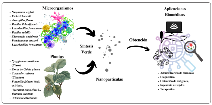Figura 1 Síntesis verde de NPs de microorganismos/plantas para aplicaciones biomédicas.