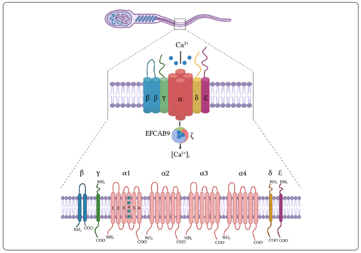 Figura 1 CatSper. El canal, ubicado en la pieza principal del flagelo del espermatozoide, forma un complejo heteromérico que consta de cuatro subunidades α que forman un poro y seis subunidades auxiliares: CatSper β (beta), CatSper δ (delta), CatSper γ (gamma), CatSper Ɛ (épsilon), CatSper ζ (zeta); y EFCAB9 (proteína similar a la calmodulina que actúa como un sensor dual para Ca2+ y pH). Cada subunidad α está formada por seis segmentos transmembrana (S1-6), de los cuales S4 detecta el voltaje a través de los aminoácidos cargados positivamente (lisina/arginina) y S5-6 forman el poro del canal (Rahban & Nef, 2020).