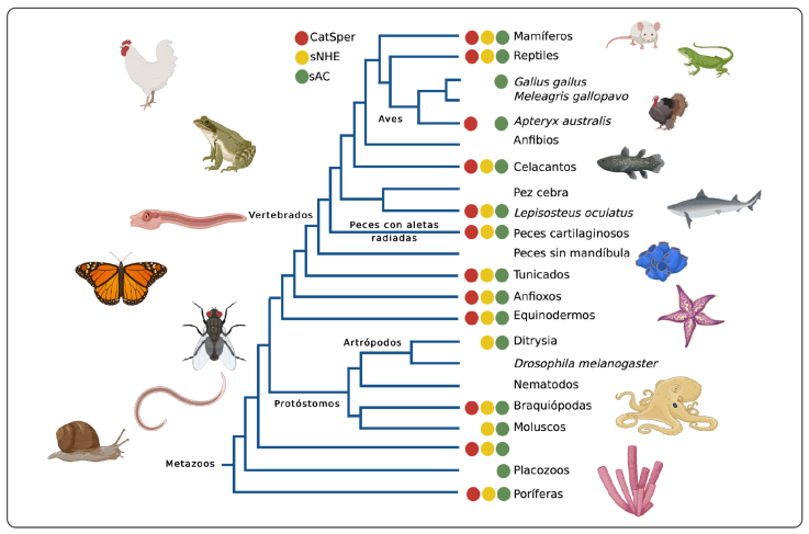 Figura 3 Distribución filogenética de CatSper, sNHE y sAC en mamíferos, reptiles, aves, peces, artrópodos y protóstomos. Cada círculo de color representa la presencia de la proteína: rojo-CatSper, amarillo-sNHE y verde-sAC.