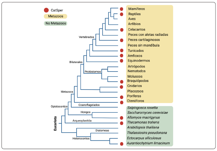 La distribución filogenética de CatSper se ha correlacionado con otras proteínas involucradas en la movilidad espermática como: El intercambiador Na+/H+ específico del espermatozoide (sNHE), proteína transmembranal encargada de regular el pH intracelular (pHi), (Wang, King, Quill, Doolittle & Garbers, 2003); el adenilato ciclasa soluble (ACs), es el responsable de la síntesis del monofosfato de la adenosina cíclico (AMPc) y la activación de la proteína quinasa A (PKA), (Xie et al., 2006). Al reportar que las especies de metazoos que conservan CatSper también conservan sNHE y ACs, sugieren una coevolución entre las tres proteínas (Figura 3).