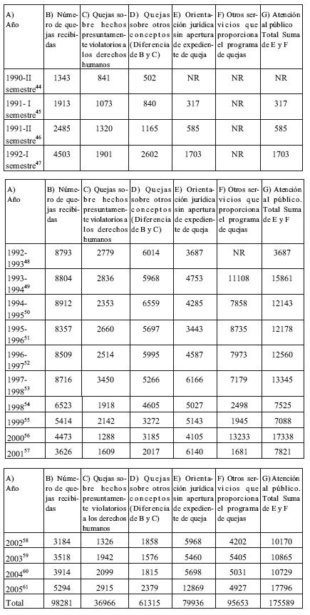 a) Efectivamente la recepción de quejas por presuntas violaciones a los derechos humanos, es una labor fundamental en el trabajo que la CNDH realiza, pero además la prestación de otros servicios al público también es muy importante a grado tal que durante el periodo de 1999 a 2005, en el cambio de diseño estructural, se ha presentado una curva ascendente que se mide no solamente por el número de quejas recibidas, sino por el número completo de personas que acudieron a solicitar ayuda de la Comisión Nacional.