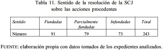 De estos datos se desprende que prácticamente en el 70% de los casos en los que la Suprema Corte de Justicia ha entrado al fondo, ha estimado que existe, total o parcialmente, una violación a la Constitución. Visto de otro manera, y tomando el total de las acciones de la muestra (n=315 incluyendo improcedencia y desestimadas), en el 54% de los casos se ha encontrado que existe una violación a la Constitución. En otras palabras, una de cada dos acciones que se promueven resulta fundada o parcialmente fundada.