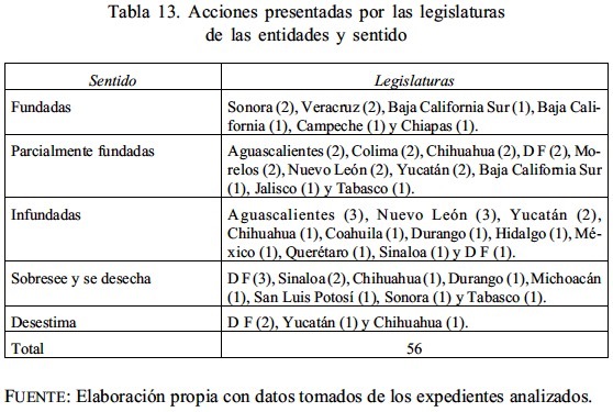 En este caso no encontramos una correlación significativa de los resultados. Así, Aguascalientes presenta dos acciones parcialmente fundadas y tres infundadas, mientras que Nuevo León y Yucatán presentan dos parcialmente fundadas y tres y dos infundadas respectivamente, en contraste con legislaturas como las de Campeche y Chiapas, que promovieron en una sola ocasión y ésta fue fundada. El caso de la Asamblea Legislativa del Distrito Federal de las ocho acciones interpuestas, tres se sobreseen, dos se desestiman, una es infundada y sólo dos son parcialmente fundadas.