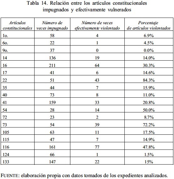 Existen varios aspectos que sobresalen de la tabla anterior. El primero, es que no existe una relación entre los artículos que los promoventes consideran violados con más frecuencia con aquellos que la Corte determina que en efecto existió una violación. Por ejemplo, los artículos 14 y 16, relacionados con las garantías de legalidad y seguridad jurídica, fueron considerados como violentados en 136 y 211 ocasiones, pero se determinó que fueron efectivamente transgredidos sólo en 19 y 64 ocasiones, es decir, 14 y 30%, respectivamente.