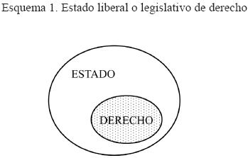 De esta forma, si quisiéramos reflejar de acuerdo con la teoría de los conjuntos la relación existente entre el Estado liberal o legislativo y el derecho, podríamos representarlo de la siguiente manera: