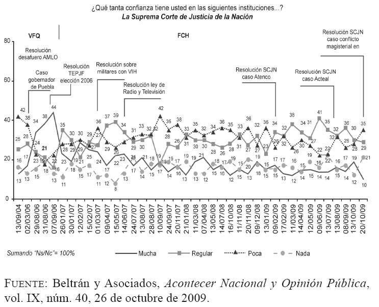 Al mismo tiempo, es interesante observar que las resoluciones de la Corte en los casos que han tenido más cobertura mediática no parecen impactar de forma significativa los niveles de confianza. Habría que hacer estudios de mayor profundidad respecto a esta cuestión; sin embargo, es posible que las estimaciones de la prensa y la opinión pública que son resoluciones de alto impacto no tengan que ver con lo que los ciudadanos comunes y corrientes estiman que son sus problemas fundamentales y las injusticias que perciben o padecen. Además, una de sus facultades más visibles, la de investigar un asunto particularmente delicado, como el de los presuntos excesos del gobierno frente a la APPO en el 2006 contemplado así en la Constitución, termina en un mero posicionamiento de la Corte, no a acciones que validen sus conclusiones. De cualquier forma, lo que sí es posible concluir es que la Corte no logra afianzar su legitimidad en la sociedad.