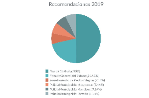 Algunos datos relevantes sobre las recomendaciones emitidas durante 2019 es que, de las 14 recomendaciones analizadas, la mitad fueron formuladas por actos de elementos de Fuerza Coahuila; tres tuvieron como autoridad responsable a personal de la Fiscalía General del estado de Coahuila de Zaragoza; tres fueron dirigidas a policías municipales,22 y una recomendación al Ayuntamiento de Piedras Negras.