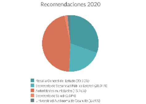 Por lo que hace a las 50 recomendaciones emitidas por la CDHEC durante 2020, en estas se diversificaron las autoridades a las que fueron dirigidas. Por ejemplo, la institución con mayor número de recomendaciones fue la Fiscalía General de Justicia del Estado, con 18; seguida por la Secretaría de Seguridad Pública estatal con 12 recomendaciones. 27 recomendaciones fueron dirigidas a autoridades de 13 municipios de Coahuila;25 una a la Secretaría de Salud del Estado; y una recomendación a la Universidad Autónoma de Coahuila.