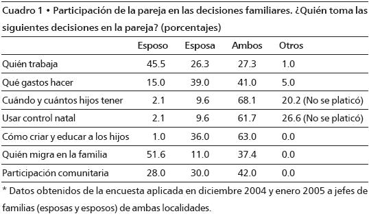 Algo notorio de la encuesta aplicada en ambas localidades fue la proporción de decisiones tomadas en pareja. Esto nos dio elementos para afirmar que estamos ante una nueva forma de organización familiar donde las decisiones ya no pueden ser calificadas como unilaterales, sino que existe mayor posibilidad de que se tomen de manera conjunta por la pareja, lo que evidencia posibles cambios en las relaciones de pareja y entre los géneros en muchas de las parejas de las localidades de estudio. Esto nos hace suponer cambios en las formas de convivencia y comunicación en las parejas para tomar decisiones en conjunto; aunque es claro que en ciertos aspectos todavía se mantiene una división de tareas entre hombres y mujeres, lo que lleva a que cada uno de ellos decida en las actividades o aspectos que tradicionalmente se califican como propias de su sexo. Es el caso de los gastos cotidianos que aparecen como una de las actividades donde las mujeres son relativamente autónomas para decidir cómo y en qué se gasta.
