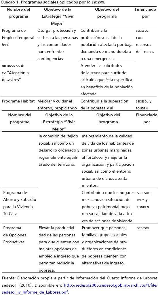 En la aplicación de los programas sociales colaboraron tres dependencias federales: Secretaría de Desarrollo Social (SEDESOL), Secretaría de Gobernación (SEGOB) y Secretaría de Economía (SE), con acciones que favorecieron la reconstrucción del pueblo y en lo posible mejorar las condiciones de vida de los habitantes. La atención urgente a las comunidades afectadas por los desastres es uno de los cinco objetivos principales que la Sedesol combate bajo su estrategia de "Vivir Mejor" (ver cuadro 1).