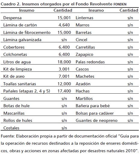 Durante los primeros días después del desastre, cuando la comunidad se encontraba en estado de emergencia, el Departamento de Protección Civil Michoacán se dio a la tarea de realizar la primera evaluación de daños en la infraestructura de las viviendas, con lo cual se logró calcular la dimensión de la tragedia y las carencias de la población, y se ingresó la solicitud para el Fondo Revolvente del FONDEN, misma que el día 5 de febrero fue aprobada y aplicada inmediatamente a las necesidades básicas de la población en los municipios de Angangueo, Tuxpan y Tuzantla, Michoacán (ver cuadro 2).