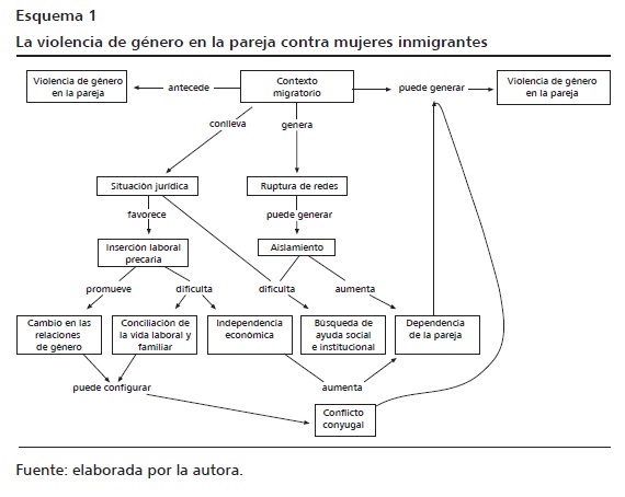 Los cimientos del asentamiento de la población migrante en la sociedad española están marcados por la precariedad, pues la inestabilidad laboral, sumada a las dificultades de encontrar vivienda digna y las posibles actitudes racistas de la población local, hacen difícil la tarea de la integración social. Debido a los factores que se han expuesto anteriormente, cabe esperar que las mujeres inmigrantes padezcan más violencia de género en la pareja, puesto que están más desprotegidas que las españolas, no cuentan con su red familiar y disponen de menos acceso a los recursos externos (apoyo institucional, empleo, ayudas económicas) (Rodríguez, 2009).