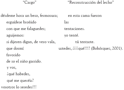 En el primer caso, Bohórquez imita un lenguaje arcaizante que hace recordar el del amor cortés, que fuera popular durante la Edad Media y el Renacimiento. Los verbos con que inician los dos primeros versos se encuentran en modo imperativo, pero el segundo (equivalente a "yérguete" en español moderno) establece una situación erótica que se completa con la ambigüedad de "me falaguedes", que (en un contexto superficial) debería significar "me halagues", pero que inevitablemente remite a la idea de "falo", con lo que "aguijemos" (que constituye un verso completo, como para darle toda la importancia que el caso amerita) adquiere significado similar al de "cojamos, cohabitemos". Así, el título "Cargo" se refiere a la acusación a que se hará acreedor el Yo poético: "si me acusaran, que me acusen de haber dormido, por mi fortuna, debajo del niño hermoso".