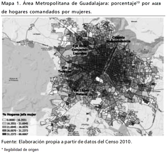 Ya se ha discutido la forma como el desplazarse a habitar los suburbios acarreaba para las mujeres la ruptura de no pocos vínculos sociales y de apoyo, que las podían ayudar a compaginar 'obligaciones' domésticas y trabajo remunerado. El resultado solía ser un menor acceso de las mujeres suburbanas al mercado laboral. En el Área Metropolitana de Guadalajara este extremo lo comprobamos si observamos la distribución a lo largo del territorio de los hogares comandados por mujeres (mapa 1).