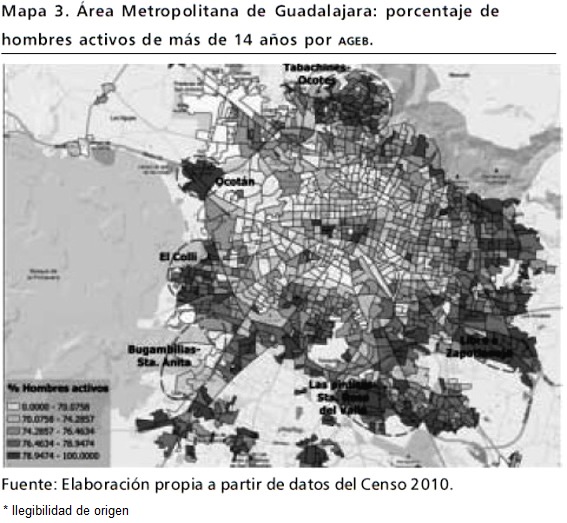 Los escasos niveles de actividad de las mujeres en las áreas suburbanas de la ciudad tienen su complemento con los elevados niveles de actividad de los hombres, como se aprecia en el siguiente mapa 3.