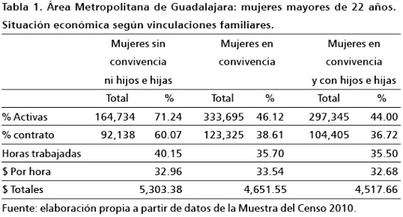 En Guadalajara se ha comprobado cómo la acumulación de vínculos familiares y de obligaciones de cuidado comporta que las mujeres salgan menos, y en peores condiciones, a emplearse en el mercado laboral remunerado. La discriminación dentro del hogar se traduce en una segregación vivida en el mundo del trabajo: las mujeres empleadas aspiran a trabajar menos horas, los niveles de informalidad y temporalidad son mayores, disfrutan de menos prestaciones y ganan menos dinero. Estas peores condiciones laborales, a su vez, refuerzan la discriminación en el hogar puesto que, si bien existe un considerable número de mujeres que son económicamente activas; esto no se refleja en que se las llegue a considerar como jefas de familia. Estas tendencias a escala global tienen su fiel manifestación en el Área Metropolitana de Guadalajara.