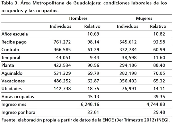 Aunque la literatura ha señalado que una fuente segura para la segregación de las mujeres en el mercado laboral es una menor cualificación adquirida, éste no es el caso dentro del Área Metropolitana de Guadalajara. Hombres y mujeres que se encuentran ocupados tienen más de diez años y medio de escuela aprobados. Sin embargo se evidencia que esto no es óbice para que las mujeres se encuentren discriminadas en casi todos los rubros respecto a los varones. Son menos las mujeres que reciben pago por la ocupación que desempeñan (un 93.58% frente al 98.14% de los hombres). Y aunque ellas tienen unos niveles de contratación formal similares a los de los hombres; los contratos suelen ser más temporales que para el caso de ellos (11.60% de los contratos son temporales frente al 9.44% en el caso de los hombres).