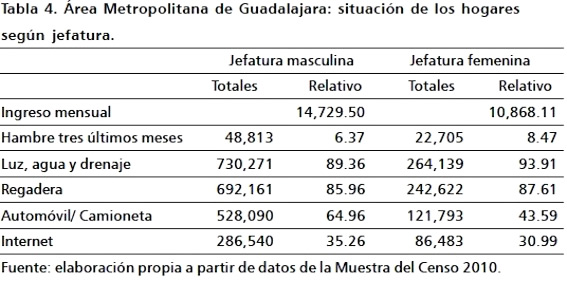 Como vemos, las condiciones de las viviendas son muy similares a si la jefatura del hogar es masculina o es femenina. En algunos casos las viviendas comandadas por mujeres ofrecen mejor infraestructura (en la disposición de servicios de electricidad, agua, drenaje y regadera). Sin embargo los hogares encabezados por mujeres van a la zaga de los comandados por hombres en lo que respecta a la posesión de automóviles y de internet (tabla 4). Sin duda estas dos características redundan en las dificultades de movilidad de las mujeres, reforzando su fijación al espacio del hogar, y condicionando las posibilidades laborales. Pero donde los hogares de jefatura femenina se encuentran en una más clara desventaja respecto a los de jefatura masculina es en el nivel de vida desarrollado. Los ingresos mensuales del primer tipo de hogares son sensiblemente inferiores a los hogares con jefatura masculina (un 27% menos). Esto se traduce en un indicador que si bien no es muy cuantioso, sí delata situaciones agudas de pobreza. En 8.47 de cada 100 hogares de jefatura femenina alguno de sus integrantes pasó hambre en los últimos 3 meses respecto a la realización de la encuesta.