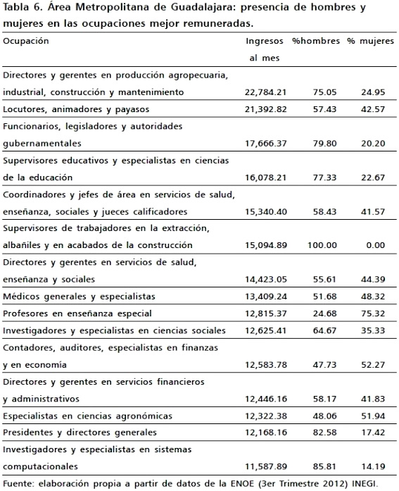 Sean las ocupaciones mas aventajadas propias de la particularidad local de Guadalajara, o respondan a las nuevas necesidades del capitalismo global, lo cierto es que en todas ellas la presencia de las mujeres es baja. Especialmente relevante es su infra-representación en las actividades directivas, sobre todo en aquellas actividades más 'pesadas', y que tradicionalmente han sido coto privado de los hombres: directores de producción agropecuaria, industrial y construcción (24.95% de mujeres) y supervisores de construcción (ninguna mujer como supervisora). Pero también sucede en los empleos que hemos consignado como técnicos, requeridos por este último capitalismo, y a los que no llegarían las mujeres debido a que las carreras que ellas eligen están más relacionadas con las humanidades. Así, las investigadoras y especialistas en ciencias sociales representan sólo el 35.33% de los empleados, y las investigadoras y especialistas en sistemas computacionales tan sólo llegan al 14.19% del total trabajadores.