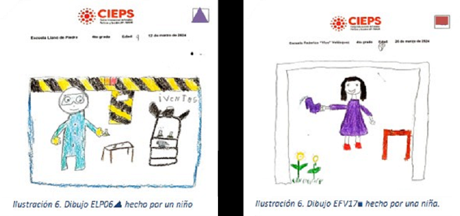 En cada escuela se realizaron talleres exploratorios con dinámicas participativas lideradas por las investigadoras de aproximadamente tres horas para conocer sus aspiraciones mediante respuesta a la pregunta ¿Qué quieres ser cuando seas grande? También se les entregaron cajas con 12 crayones de colores y se les pidió que dibujaran cómo se imaginan a una persona que hace ciencia, y que incluyeran en el dibujo el entorno en el que se encuentra, la actividad que realiza, así como detalles sobre su vestimenta y herramientas que utiliza, en hojas que permitieron identificar fecha, escuela y sexo de la persona autora. Finalizados los dibujos y pegados en un lugar visible, cada niño y niña realizó una descripción detallada de su dibujo, los cuales fueron codificados con las siglas, la escuela y un número, así como si fueron realizados por niña (A) o niño (B).