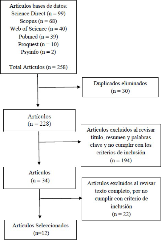 En la búsqueda se identificaron 258 artículos potencialmente relevantes. Después se eliminaron los duplicados utilizando el gestor de referencias Mendeley Desktop se redujo a 228, los cuales fueron revisados por dos revisores y un tercero en caso de discordancia, se descartaron por título, resumen y palabras clave y no cumplir con los criterios de inclusión y se redujo el número a 34 estudios, se hizo una revisión de texto completo y fueron seleccionados 12 artículos para ser incluidos en la revisión por cumplir completamente con los criterios de inclusión (ver Figura 1).