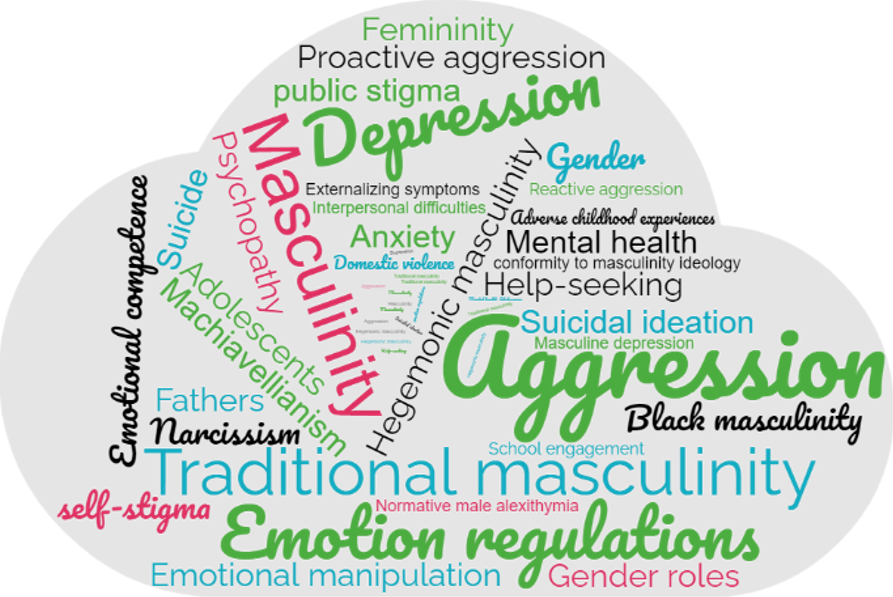 Una representación gráfica mediante una nube de palabras (ver Figura 2) ha revelado que de las 51 palabras clave de las investigaciones examinadas relacionadas con el tema factores causales y variables psicológicas en la masculinidad tradicional/hegemónica las más frecuentes fueron masculinidad (4), masculinidad tradicional (4), masculinidad hegemónica (4), agresión (3), depresión (2), regulación emocional (2), búsqueda de ayuda (2), salud mental (2), e ideación suicida (2).