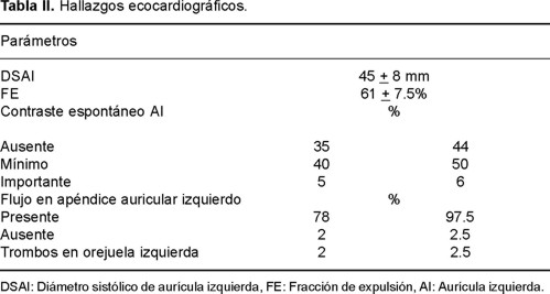 Hallazgos ecocardiográficos. El diámetro promedio de la AI fue de 45 ± 8.4 cm (extremos 29-60), la fracción de expulsión del ventrículo izquierdo de 61 ± 7.5%; el grado de contraste espontáneo en la AI fue ausente en 35 pacientes, mínimo en 40 e importante en cinco, en cuanto a flujo en el AAI, 78 tenían tipo II y dos tipo III, en dos pacientes detectamos trombos en AAI (Tabla II). La función contráctil de la AI valorada a la semana poscardioversión, mostró recuperación más rápida en los pacientes con FA de menos tiempo de evolución 42.35 ± 20.30 vs 32.40 ± 16.35 (cm/sec).