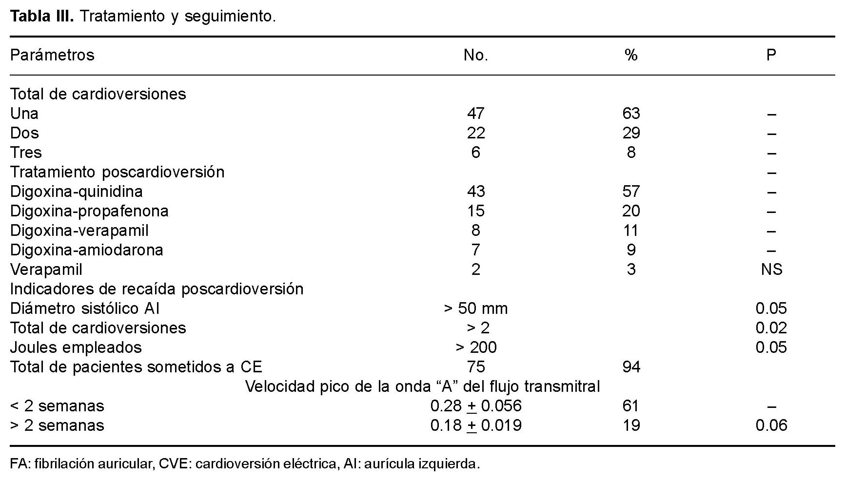 La patología más frecuentemente asociada fue hipertensión arterial y en segundo lugar cardiopatía reumática. Los indicadores de recaída poscardioversión fueron: diámetro de AI > 50 mm, 51.11 ± 6.91 vs 44.60 ± 7.77, respectivamente (P < 0.05), > 2 cardioversiones para conseguir la restauración del ritmo sinusal (P 0.02) y más de 200 Joules utilizados (p = < 0.05). Finalmente con respecto a la recuperación de la función contráctil de la AI evaluada una semana después de la cardioversión, fue más rápida en el grupo de pacientes con duración de la fibrilación auricular de menos de dos semanas de evolución 0.28 + 0.056 vs 0.18 ± 0.019 m/sec (p = 0.06) (Tabla III).