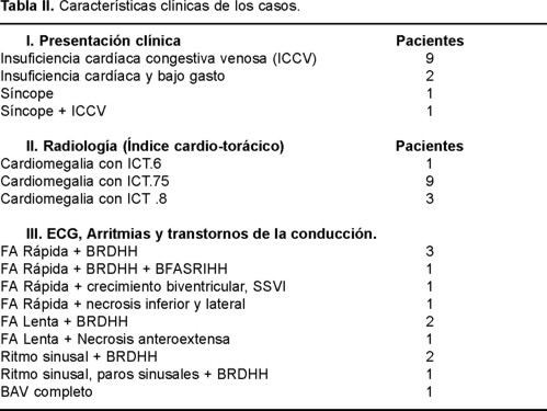 El ECG fue herramienta diagnóstica valiosa, mostró trastornos del ritmo en 11 pacientes, con fibrilación auricular y respuesta ventricular rápida en 6 casos (46%), o lenta en 3 más (23%) y extrasístoles ventriculares en 2 o más (15%). Hubo trastornos de la conducción con bloqueo de la rama derecha del haz de His (BRDHH) en 9 (69%), uno asociado a bloqueo del fascículo anterosuperior de la rama izquierda del haz de His (BFAS), bloqueo AV completo (BAV) en otro y paros sinusales en uno más (Tabla II). Otro hallazgo de importancia fue la presencia de zonas eléctricamente inactivables en 2 casos, simulando cardiopatía isquémica. En un caso hubo datos electrocardiográficos de crecimiento biventricular, conforme a los criterios de la Escuela Mexicana de Electrovectocardiografía.23