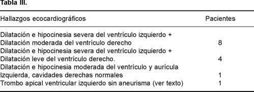 La radiografía del tórax fue anormal en 12 casos; el índice cardiotorácico igual o > 0.75 se encontró en 9 (69%) y en 3 más fue > 0.8. El ecocardiograma confirmó la dilatación de las cuatro cavidades del corazón, el ventrículo izquierdo estaba afectado en todos los casos. La fracción de expulsión calculada por el método área/longitud, fue < 30% en 12 casos, sólo 1 enfermo tenía una fracción de expulsión normal, > 45%. No se identificó aneurisma apical, en un caso había un trombo intraventricular izquierdo en el ápex, (Tabla III).