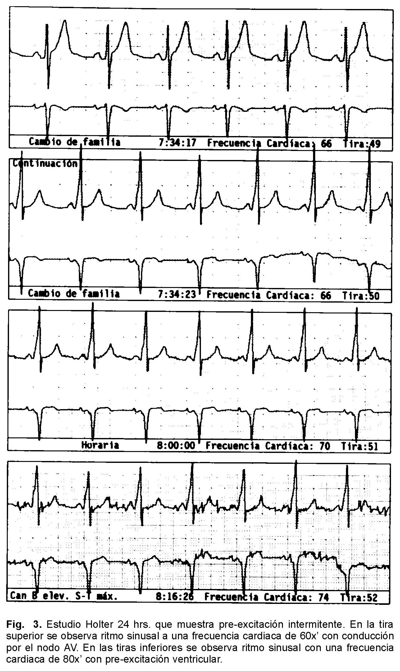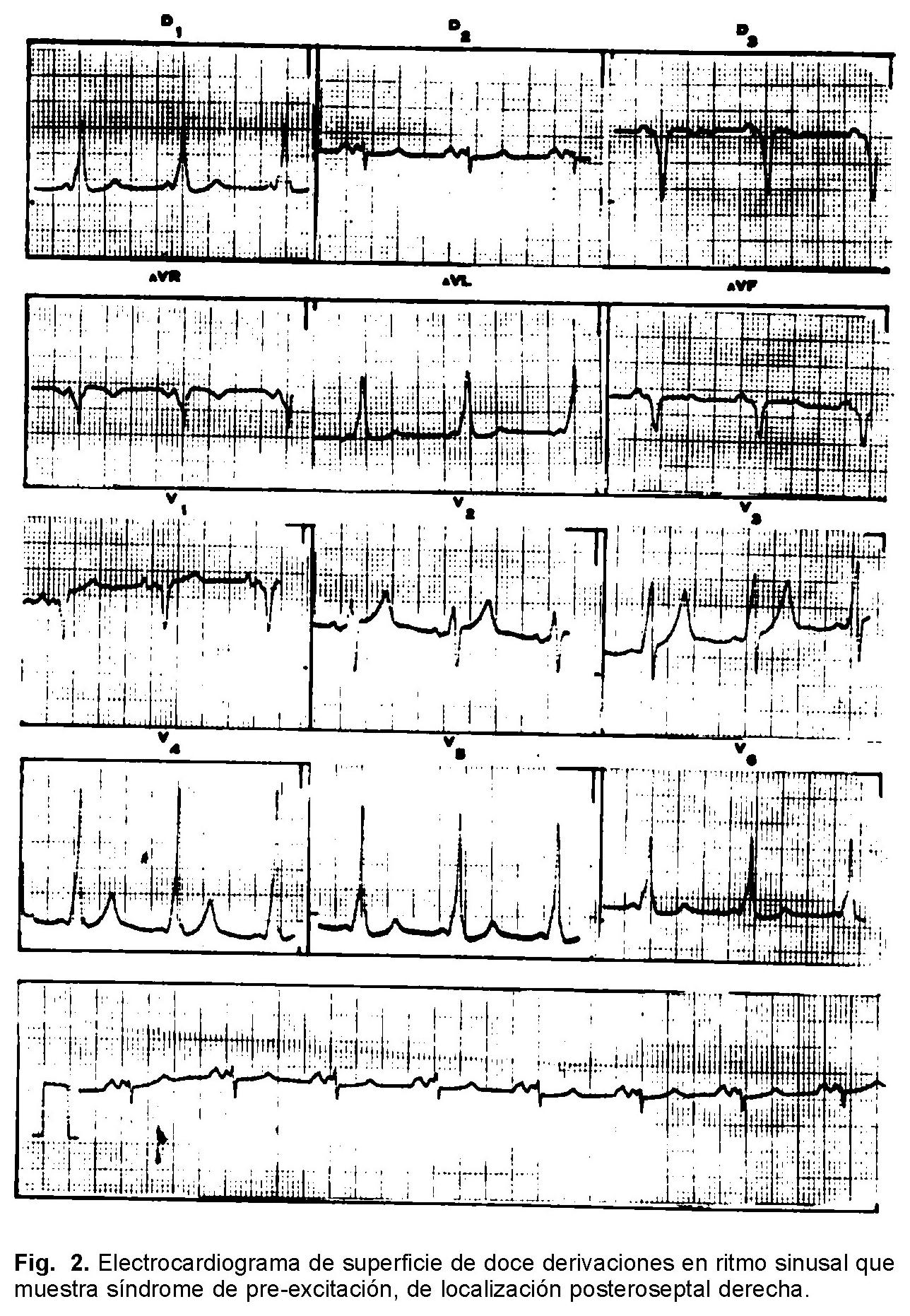 Paciente del sexo masculino, deportista jugador regular de tenis, sin antecedentes familiares de muerte súbita o enfermedad cardiaca conocida; sano hasta el inicio del padecimiento actual. Asintomático cardiovascular hasta la edad de 44 años cuando en forma súbita presentó palpitaciones rápidas, disnea y lipotimia, motivo por el cual fue llevado al servicio de urgencias de un hospital de su localidad donde se recibió disneico, diaforético e hipotenso; el electrocardiograma de superficie (ECG) (Fig. 1) mostró taquicardia de QRS ancho, irregular con un intervalo RR < 200 mseg, compatible con fibrilación auricular en presencia de una vía accesoria postero-septal derecha, fue tratado con cardioversión eléctrica por desarrollar fibrilación ventricular. El ECG posterior a la estabilización del cuadro mostró ritmo sinusal con síndrome de pre-excitación de localización posteroseptal derecha (Fig. 2). Se realizó monitoreo Holter 24 hs donde se documentó ritmo sinusal con síndrome de pre-excitación intermitente a frecuencias cardiacas bajas (Fig. 3). En dos ocasiones más, a pesar del tratamiento médico, presentó fibrilación auricular con conducción por la vía accesoria y compromiso hemodinámico que ameritaron internamiento y cardioversión eléctrica. Llamó la atención a la exploración física la presencia de un soplo regurgitante mitral II/IV, por lo que se realizó ecocardiograma, el cual mostró insuficiencia mitral moderada por prolapso valvular mitral secundario a probable ruptura de cuerda tendinosa. El atrio izquierdo midió 45 mm, el diámetro diastólico del ventrículo izquierdo fue de 54 mm, y la fracción de expulsión del 62%.