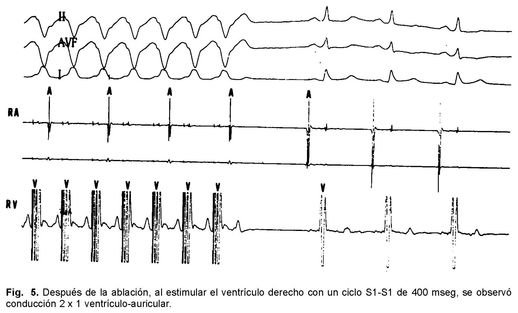 Con estos hallazgos se decidió realizar estudio electrofisiológico, durante el cual se obtuvo un periodo refractario efectivo de la vía accesoria superior a 350 mseg. Se localizó el sitio de mayor pre-excitación en la región posteroseptal derecha sitio en el cual se aplicó radiofrecuencia a 70ºC por 4 minutos, logrando separación del aurículo y ventriculograma con pérdida de la pre-excitación (Fig. 4). La estimulación auricular postablación no evidenció pre-excitación. El punto de bloqueo ventrículo-auricular 2 x 1 se encontró con un intervalo S1-S1 de 400 mseg (Fig. 5). Al terminar el estudio, se indujo nuevamente fibrilación auricular (Fig. 6), sin observarse conducción por la vía accesoria, con respuesta ventricular media de 110 latidos por minuto. El electrograma final demostró normalización del intervalo HV y el electrocardiograma final en ritmo sinusal no mostró nuevamente la pre-excitación ventricular (Fig. 7). En su seguimiento a un año, la fibrilación auricular ha tenido un comportamiento paroxístico con conducción únicamente por el nodo auriculoventricular y sin compromiso hemodinámico.