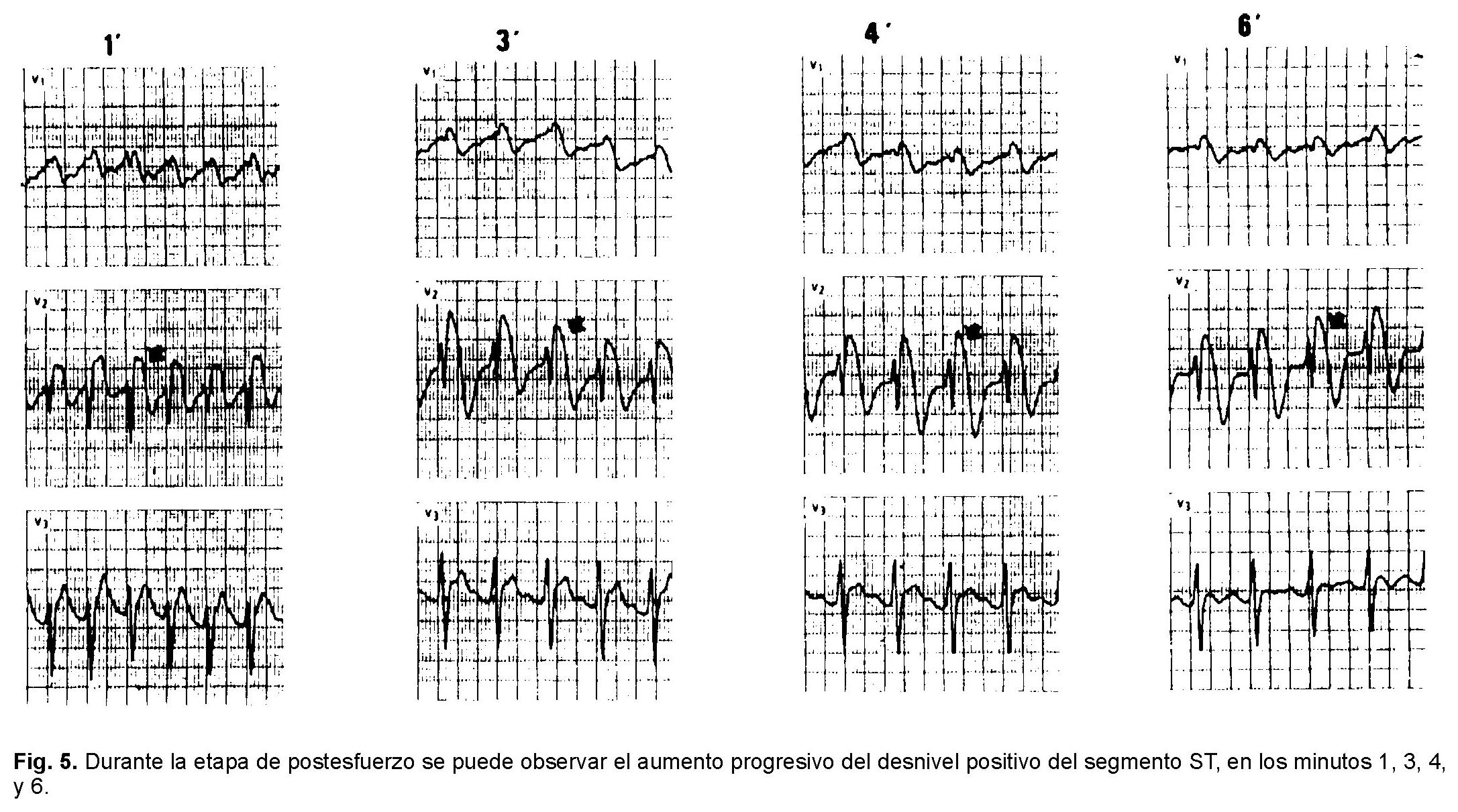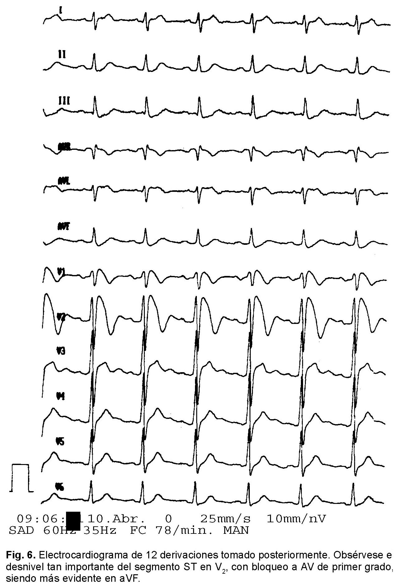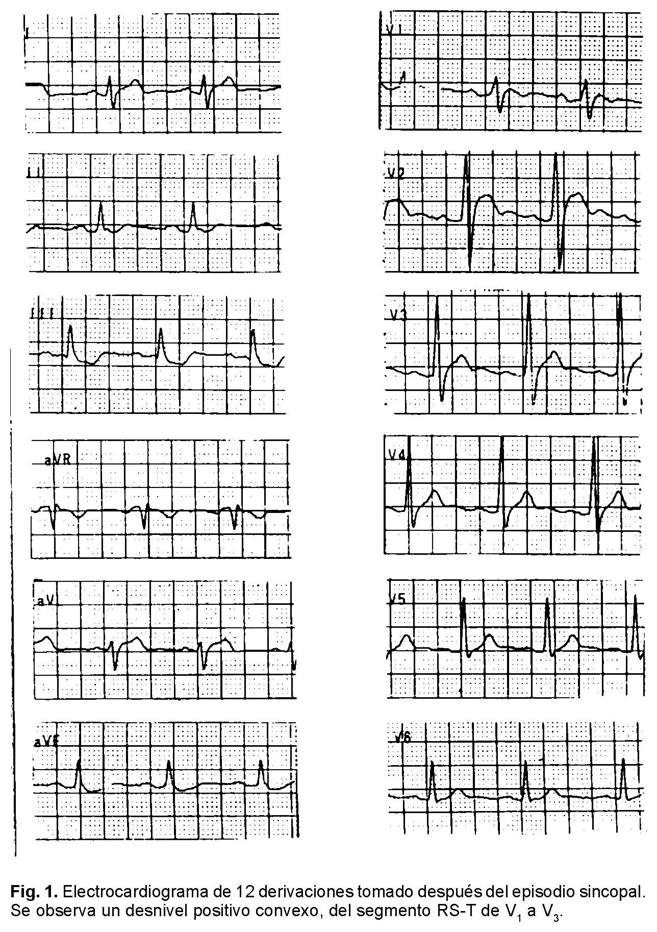 Hombre de 28 años de edad sin antecedentes de importancia y asintomático hasta que presentó síncope único sin pródromos por lo que acudió a atención hospitalaria donde no se detectó alguna alteración durante la exploración física. Un electrocardiograma tomado en aquella ocasión (Fig. 1) reveló ritmo sinusal, con una frecuencia cardiaca de 75 1pm, con ÂQRSF situado a + 70°, intervalo PR de 200 mseg, complejos S > R en V1 con desnivel positivo convexo del segmento ST (2 mm) de V1 a V3 y la presencia de onda U. Había desnivel negativo cóncavo de ST (imagen en espejo) de DIII y aVF. BRDHH de grado intermedio: tiempo de inicio de la deflexión intrinsecoide (TIDI) = 80 mseg en aVR y 40 mseg en V1. Posteriormente, en un estudio de rutina, se tomó un electrocardiograma (Fig. 2) que evidenciaba un cuadro de bloqueo de rama derecha del haz de His de grado intermedio; TIDI = 75 mseg en aVR y 35 mseg en V2 6a y elevación del segmento ST convexo de V1 a V3, de más de 3 mm. Una radiografía de tórax y un ecocardiograma transtorácico en modo M, bidemensional y Doppler codificado a color no detectaron alteraciones estructurales. Se decidió realizar un estudio Holter de 24 horas observando pausas sinusales de 2,400 mseg y bloqueo sinoauricular de segundo grado (Mobitz II) durante la noche (Fig. 3). Una prueba de esfuerzo con protocolo de Bruce demostró, durante el ejercicio, una disminución de la elevación del segmento ST, en V1 y V2, más evidente en V2, hasta normalizarse (Fig. 4). Posteriormente, durante la fase precoz de la recuperación el paciente empezó a tener un desnivel positivo del segmento ST en V2 (al primer minuto), que aumentaba progresivamente hasta más de 10 mm, siendo más evidente a los 3 y 6 minutos. Se llegó a un desnivel positivo del segmento ST de 13 mm (Fig. 5). El paciente nunca presentó algún tipo de taquiarritmia durante la prueba de esfuerzo. Posteriormente, durante la consulta, se tomó un nuevo electrocardiograma que mostraba un cuadro característico de bloqueo de rama derecha del haz de His de grado intermedio y un desnivel positivo convexo del segmento ST pero con intervalo PR de 240 mseg [bloqueo A-V de primer grado] (Fig. 6). Durante el estudio electrofisiológico se indujo un episodio de FV por estimulación ventricular. Actualmente este sujeto permanece asintomático y está en espera de la colocación de un desfibrilador ventricular automático implantable.