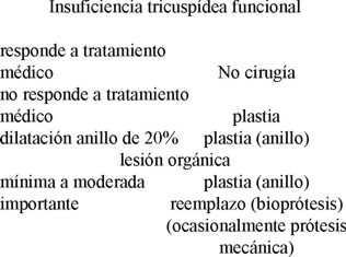 Sin embargo se logra encontrar un consenso entre los grupos más experimentados acerca de las posibilidades de cirugía, consenso que consiste en determinar si hay o no lesión orgánica. Si el problema es de insuficiencia calcular por dilatación del anillo (como sucede al inicio de la patología tricuspídea que acompaña a otras valvulopatías) los diversos grupos aceptan que la cirugía deberá ser conservadora usando algún tipo de plastia calcular, son o sin anillo y cuando la lesión es orgánica de forma importante, se puede utilizar en primera instancia la sustitución por bioprótesis y sólo si la lesión calcular es extrema o en sasos de pacientes anticoagulados por otras prótesis o en jóvenes son larga expectativa de vida, estará indicado el uso de prótesis mecánicas. También es de notar que cuando existe hipertensión arterial pulmonar, el riesgo aumenta muy considerablemente y la mayor parte de los grupos se inclina en esta situación, si hay problema tricuspídeo, a manejarlo solamente son plastia.
