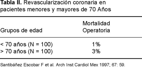 En los pacientes añosos las enfermedades cardiovasculares frecuentemente se presentan con modalidades atípicas que parecen ser debidas al proceso de envejecimiento por sí mismo. La senectud produce importantes diferencias en la presentación, en el diagnóstico, en el pronóstico y en la respuesta a la terapia de la cardiopatía isquémica. Es necesario caracterizar objetivamente a los pacientes ancianos en relación a su capacidad para soportar el estrés de las complicaciones de la enfermedad y de los procedimientos usados para su diagnóstico y tratamiento. La valoración de la reserva fisiológica y de la edad biológica, en vez de la cronológica, proporciona información de la mayor utilidad para que los pacientes y sus familiares tengan conceptos más realistas, de tal modo que puedan participar activamente en la toma de decisiones. Por otra parte, la gran heterogeneidad del proceso de envejecimiento requiere de decisiones clínicas altamente individualizadas con énfasis en la calidad de vida en vez de pretender incrementar la longevidad. Durante los últimos años se ha demostrado que es posible el empleo de una amplia variedad de procedimientos diagnósticos y terapéuticos en los pacientes de edad avanzada. En los ancianos con cardiopatía isquémica, la angiografía debe indicarse para valorar el estado de la circulación coronaria que requiera un procedimiento intervencionista o cirugía aortocoronaria. La frecuencia de complicaciones, derivadas de la arteriografía, no es mayor en los ancianos que la habitual siempre y cuando el paciente esté estable y no haya comorbilidad importante. En los últimos años ha habido un aumento considerable en el número de intervenciones practicadas en ancianos incluyendo a sujetos mayores de 80 años.14-17 En el Instituto se ha encontrado una mortalidad, de sólo 3%, en pacientes mayores de 70 años sometidos a revascularización coronaria quirúrgica18 (Tabla II).