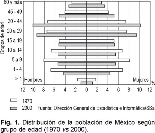 Debido a la declinación progresiva de la fertilidad y al constante aumento en la esperanza de vida, la población del mundo presentará un proceso de envejecimiento más rápido en la mitad del siglo que ahora comienza, en comparación a lo ocurrido en épocas anteriores.1 Como resultado, el patrón mundial de aumento de la población mostrará un incremento progresivo de adultos y un número cada vez mayor de personas mayores de 65 años. Sin embargo, los patrones de crecimiento de la población varían considerablemente de acuerdo con los diferentes niveles de desarrollo económico. Los países industrializados encabezan el proceso de envejecimiento, mientras que el aumento progresivo en el número de ancianos lleva un ritmo más lento en las poblaciones de los países en desarrollo. Los periodos históricos en los cuales ocurren cambios notables en la tasa de mortalidad se conocen como transiciones epidemiológicas, cuyo efecto es la redistribución de muertes de los jóvenes a los viejos.2,3 Debido al éxito en el control de diversas enfermedades infecciosas, a la declinación progresiva de las tasas de fecundidad y a profundos cambios en el estilo de vida, la República Mexicana se encuentra en una transición epidemiológica que aún no concluye y que ha impactado de manera importante el patrón de población del país. En los últimos 50 años la esperanza de vida ha aumentado de 42 a 75.3 años. De acuerdo con las Proyecciones de la Población Nacional,4 la esperanza de vida aumentaría a 80.4 años en 2020 y a 83.7 años en 2050. Una persona de 65 años puede ahora esperar vivir otros 17 años y uno de 80 hasta 8 años más. La esperanza de vida tiene una gran influencia sobre el porcentaje de ancianos en una población y el incremento en la longevidad ha dado como resultado un aumento progresivo en el número y en la proporción de personas que sobreviven más allá de la séptima década de la vida. En el año 2000 el 4.7% de la población se encuentra en edades por encima de los 65 años.5 La distribución de la población por edades aparece en la forma de una pirámide. En la Figura 1 puede observarse la diferencia en las pirámides de población entre el año de 1970 y el 2000. En el año 2000, el cambio más notable consiste en la reducción de la base. El rápido crecimiento de la población juvenil que se observó en el pasado se desplaza hacia la cúspide de la pirámide con un incremento de la población de edades medias y de viejos. El descenso de la mortalidad y de la fecundidad no sólo mantendrán el ritmo que sigue el proceso de envejecimiento de la población mexicana, sino que incluso la acelerarán. El rápido crecimiento de la población senescente (65 años o más) implica que, entre 1995 y 2014, esta población duplicará su tamaño, cuando su volumen ascenderá a 8.1 millones, se habrá quintuplicado en 2034 (20.2 millones) y se habrá multiplicado ocho veces en 2050 cuando su monto superará 32 millones.4 La proyección para la primera mitad del siglo XXI es que la población envejecida (mayor de 65 años) llegará a representar la cuarta parte del total. Los "más viejos de los viejos", aquellos mayores de 80 años, experimentan el crecimiento demográfico más rápido.1