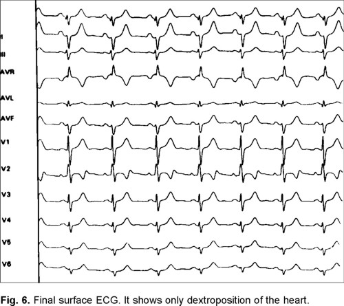 Two years after catheter ablation and surgery, the patient remains arrhythmia-free as well as cardiovascular-asymptomatic. During follow-up, serial surface ECG (Fig. 6) and Holter monitoring no delta wave and permanent sinus rhythm were found. Stress test showed NYHA functional class I. Echocardiography revealed 44 mmHg systolic pulmonary pressure and LVEF 70%. Respiratory and functional evaluation showed no changes with respect to the pre-surgical test.