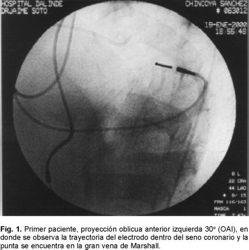Previa disección de bolsa subaponeurótica, se puncionó la vena subclavia derecha en tres ocasiones, se colocó en cada punción una guía "J" metálica de 0.35" hasta la vena cava inferior y a través de introductores de teflón 10 Fr, se pasaron los 3 electrodos de marcapaso, dos bipolares de fijación activa (Medtronic Capsure Fix), el primero se posicionó en el ápex del ventrículo derecho fijándolo con el sistema "screw in", los umbrales obtenidos fueron con ancho de pulso de 0.4 ms, la amplitud de pulso de 0.7 V, corriente de 1.4 mA, onda R de 13.4 mV con Slew/rate de 0.69 mV/ms, y resistencias de 650 Ohms. El segundo electrodo de fijación activa, se colocó en la pared libre del atrio derecho, los umbrales fueron con ancho de pulso de 0.5 ms, amplitud de pulso de1.0 V, corrientede2.0mA, onda P de 2.4 mV, Slew/rate de 0.11 mV/ms y resistencias de 770 Ohms. A continuación se colocó el tercer electrodo, éste específicamente diseñado para seno coronario (Medtronic 2188) que cuenta con guía preformada para facilitar su introducción en el sistema venoso coronario, el electrodo cuenta con dos curvas, una de 45 grados en la parte distal para dar mayor estabilidad y contacto de la punta con la vena en donde se aloja y otra secundaria más proximal, de la misma angulación. Este electrodo se colocó bajo visión fluoroscópica en oblicua anterior izquierda (OAI) a 30 grados para canular el seno coronario, inicialmente se avanzó hasta la gran vena cardiaca y se giró hacia la aurícula, se retiró lentamente hasta encontrar una vena atrial lateral en donde se encontraron adecuados umbrales pero se desplazó el electrodo en 3 ocasiones por lo cual se realizó visualización angiográfica del seno coronario, en la fase venosa (mediante angiografía selectiva de la coronaria izquierda) donde se pudo identificar la vena oblicua atrial izquierda de Marshall en donde se colocó la punta del electrodo (Fig. 1), dicha posición se confirmó en la oblicua anterior derecha (OAD) a 30 grados (Fig. 2) en donde se puede observar que la punta del electrodo se dirige hacia el atrio, en ese sitio los umbrales de estimulación fueron, ancho de pulso de 0.4 ms, amplitud de pulso 1.5 V, corriente de 3.7 mA, onda P de 5.6 mV con Slew/rate de 0.35 mV/ms y resistencias de 500 Ohms.