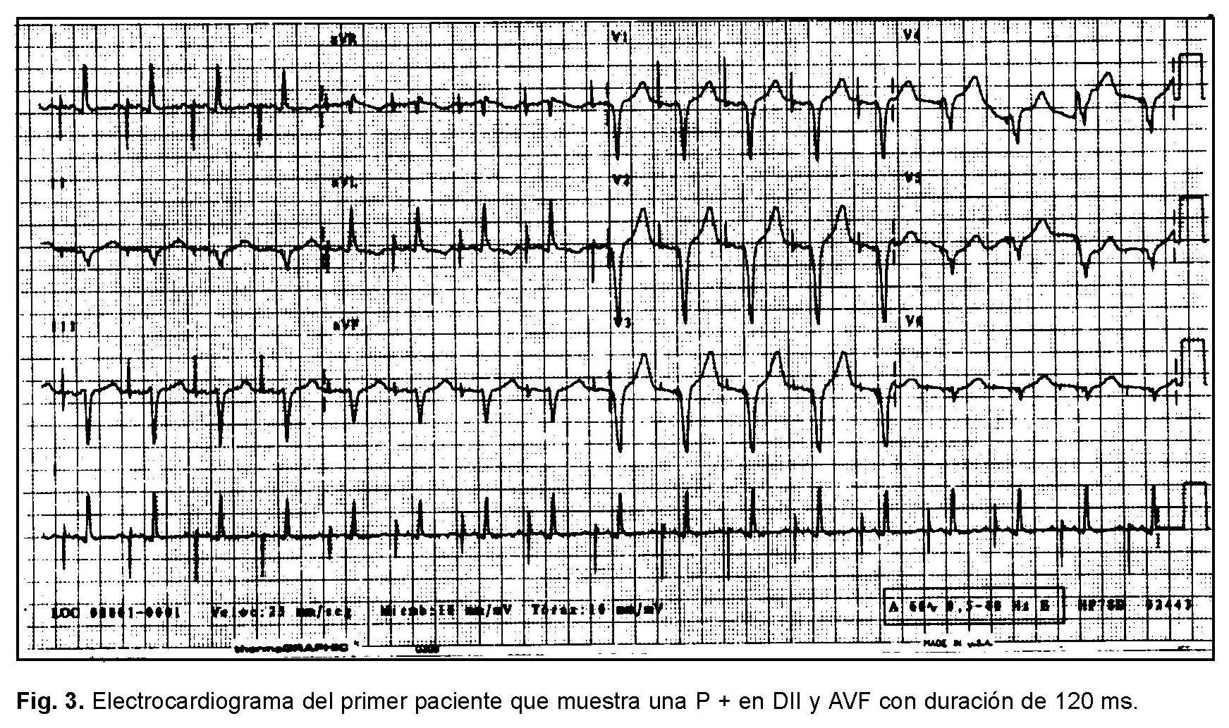 Se conectaron ambos electrodos atriales a un adaptador en "Y" (Medtronic 5866-38) bipolar en línea a bipolar bifurcado en serie, el electrodo del atrio izquierdo se conectó al cátodo y el ánodo al atrio derecho. Este adaptador se conectó al puerto atrial y el electrodo del ápex del ventrículo derecho al puerto ventricular del generador de pulso (Actros DR Biotronik), el cual se introdujo en la bolsa subaponeurótica, cerrándose por planos en forma convencional. La programación de la fuente de marcapaso fue de la siguiente forma, frecuencia básica de 85 ppm, función nocturna de 70 ppm, frecuencia superior de 160 ppm y retraso AV dinámico de 180 ms. El modo de estimulación fue DDD o como propusimos previamente TTD (Three, Three, Dual).17 Finalmente se complementó el estudio angiográfico y ventriculografía, sin lesiones coronarias y FE del 70%. En el ECG de 12 derivaciones (Fig. 3) la espiga de estimulación atrial no tiene cambios a lo habitual, la morfología de la onda P es + en DII y aVF, + en DIII y - en aVR su duración es de 120 ms.