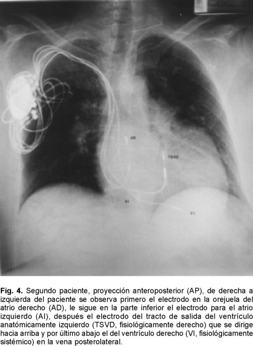 Técnica de implantación. Se realizó punción subclavia derecha en 4 ocasiones, una vez que se había realizado la bolsa subaponeurótica. Se utilizaron 2 electrodos de fijación activa (Capsure Fix de Medtronic) para el tracto de salida del ventrículo pulmonar y para el atrio derecho y dos de seno coronario (Medtronic 2188) para la estimulación del ventrículo sistémico y el atrio izquierdo. Primeramente se implantó el electrodo para la estimulación ventricular sistémica, esto fue a través de la vena posterolateral; bajo visión fluoroscópica en antero-posterior (AP) se pudo canular, en OAD a 30 grados se avanzó lo más profundo y se corroboró la posición en OAI. Los umbrales medidos fueron ancho de pulso de 0.4 ms, amplitud de pulso 0.9 V, corriente de 1.8 mA, resistencias de 780 Ohms, onda R 9.0 V y Slew/rate 1.04 mV/ms. Posteriormente se avanzó el electrodo para la estimulación del atrio izquierdo, nuevamente abordamos el ostium del seno coronario en AP, pero en esta ocasión lo dirigimos al seno coronario que recorría el surco atrioventricular, en la OAI se dirigía hacia la izquierda, en proyección OAD se introdujo dirigiendo la punta del electrodo hacia el atrio hasta obtener los siguientes umbrales, ancho de pulso de 0.5 ms, la amplitud 0.4 V, corriente 0.9 mA, resistencias de 580 Ohms, onda P 2.0 V, Slew/rate 0.35 mV/ms. El tercer electrodo fue al tracto de salida del ventrículo anatómicamente izquierdo (VD) y éste se implantó en la parte superior del septum y por debajo del infundíbulo con los siguientes umbrales ancho de pulso 0.3 ms, amplitud de pulso 0.9 V, corriente 1.8 mA, resistencias 580 Ohms, onda R 3.2 V y Slew/rate 0.4 mV/ms. Finalmente se colocó el electrodo del atrio derecho, los umbrales fueron ancho de pulso de 0.5 ms, la amplitud 1.2 V, corriente 2.4 mA, resistencias 560 Ohms, onda P 1.9 V y Slew/rate 0.24 mV/ms. Como podemos observar en las Figuras 4,5 y 6, el electrodo del ventrículo sistémico en la proyección AP corre hacia adelante y a la izquierda, en la OAI se dirige hacia abajo y adelante y no hacia la izquierda como sucede en la anatomía habitual; mientras que el electrodo del atrio izquierdo en AP se dirige hacia adelante y abajo, por otra parte en la OAD se observa que la punta del electrodo se dirige hacia el atrio, dentro de la vena canulada. Se conectaron 2 adaptadores en "Y" uniendo los dos atrios y ventrículos entre sí, los cátodos al atrio derecho y al ventrículo anatómicamente izquierdo y después al puerto atrial y ventricular de la fuente en forma correspondiente. El modo de estimulación fue DDDR (FFDR de Four, Four, Dual y Rate), frecuencia basal de 85 ppm, función nocturna de 70 ppm, frecuencia superior de 160 ppm, con retraso AV fijo de 100 ms y con cambio automático de modo.